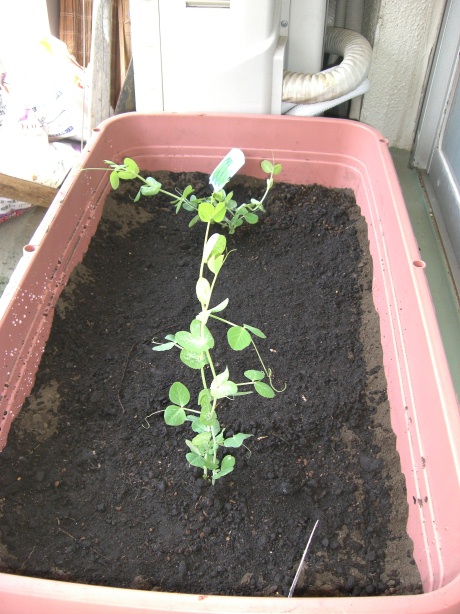 まずはこちら。見にくいですね・・・。サヤエンドウの苗です。2株だけ買ってきました。白い花と赤い花です。